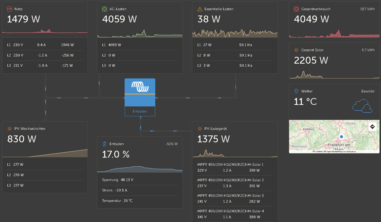 In der Remote Console steht MP2 auf “Ein” aber “Bulk”, obwohl derzeit 4600W aus dem Netz gezogen werden. Ladezusatnd Pylontech 64%