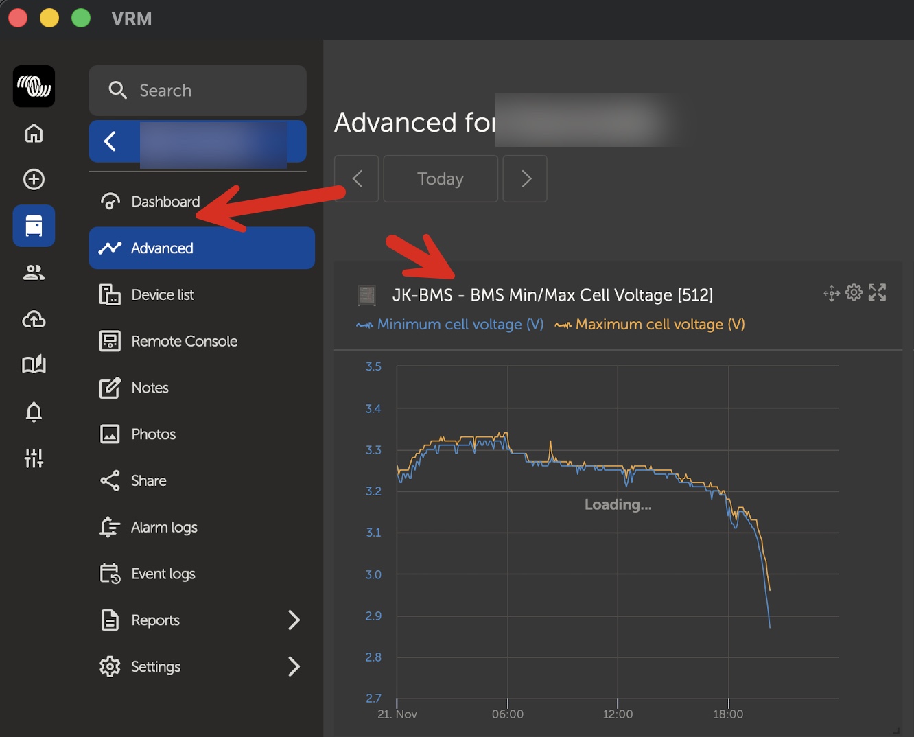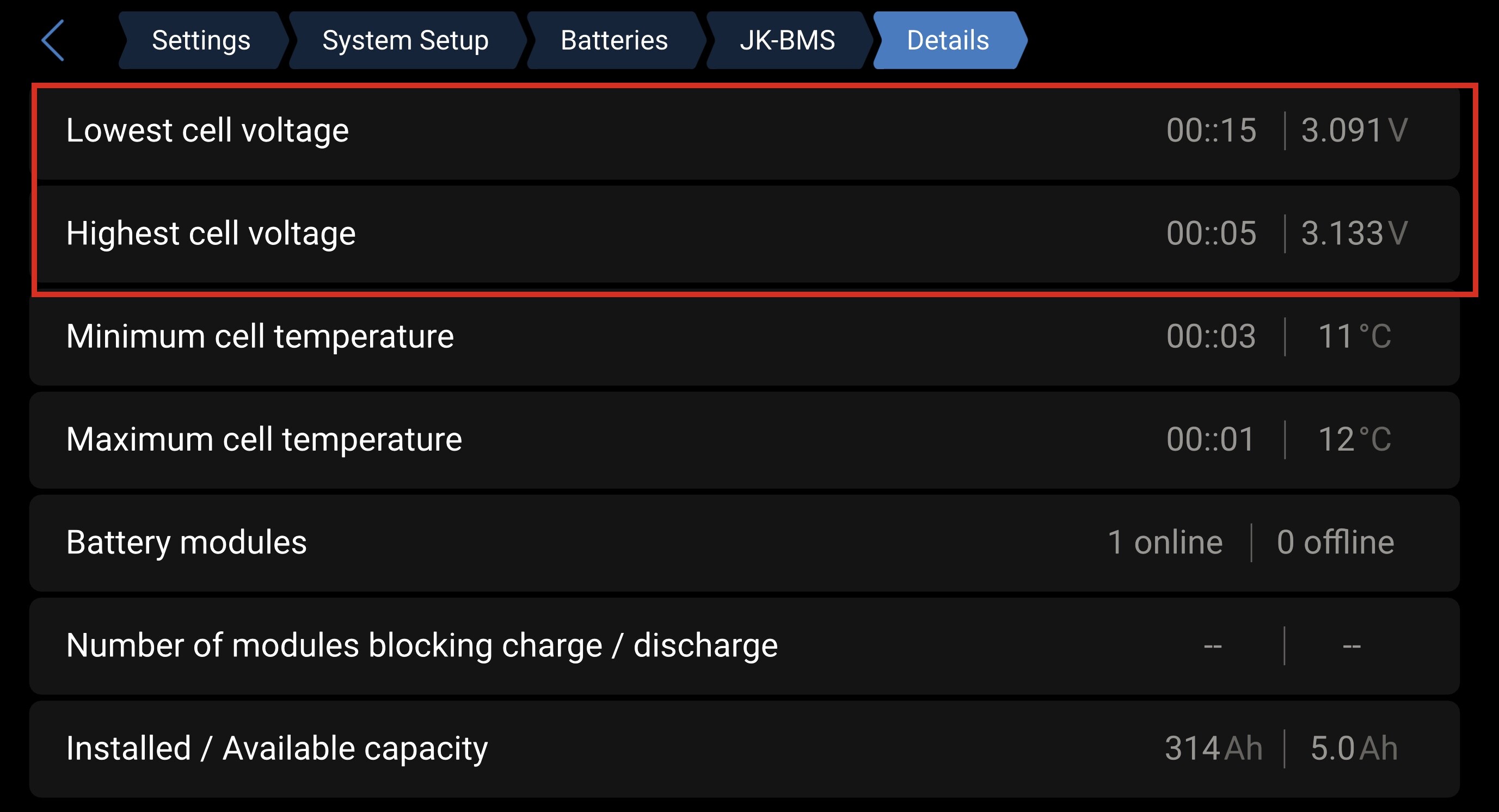 Regarding your question - if you have connected the JK BMS your GX device (Cerbo in your case) You can check balancing in the advanced tab… just activate “BMS Min/Max Voltage” for that. There you would see the max deviation between the cell with the lowest and the cell with the highest voltage.. I hope that helps.