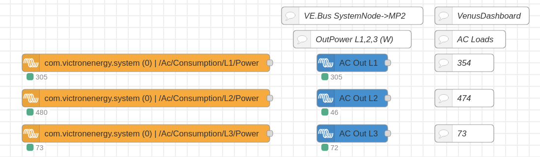 Obviously some values are calculated and not measured. Indeed, AC loads L3 has no connected load and seems only calculated inverter loss. L2 has big load, L1 has small load what possibly affects the values for any calculated grid feed in? Its suspicious that L2 displays much lower value of AC out load (1850:468) what might be a typo what happened at copy of the source lines. Is it possible to see the Victron node javascript source?