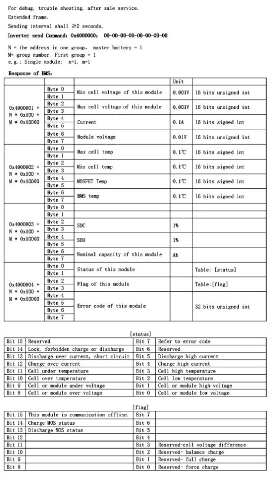 The master will respond with the information for all modules, grouped on 0x04AABBCC identifiers, where AA is group number, BB battery number on that group and CC is the type of info. The frame bytes represent the info for that info type.