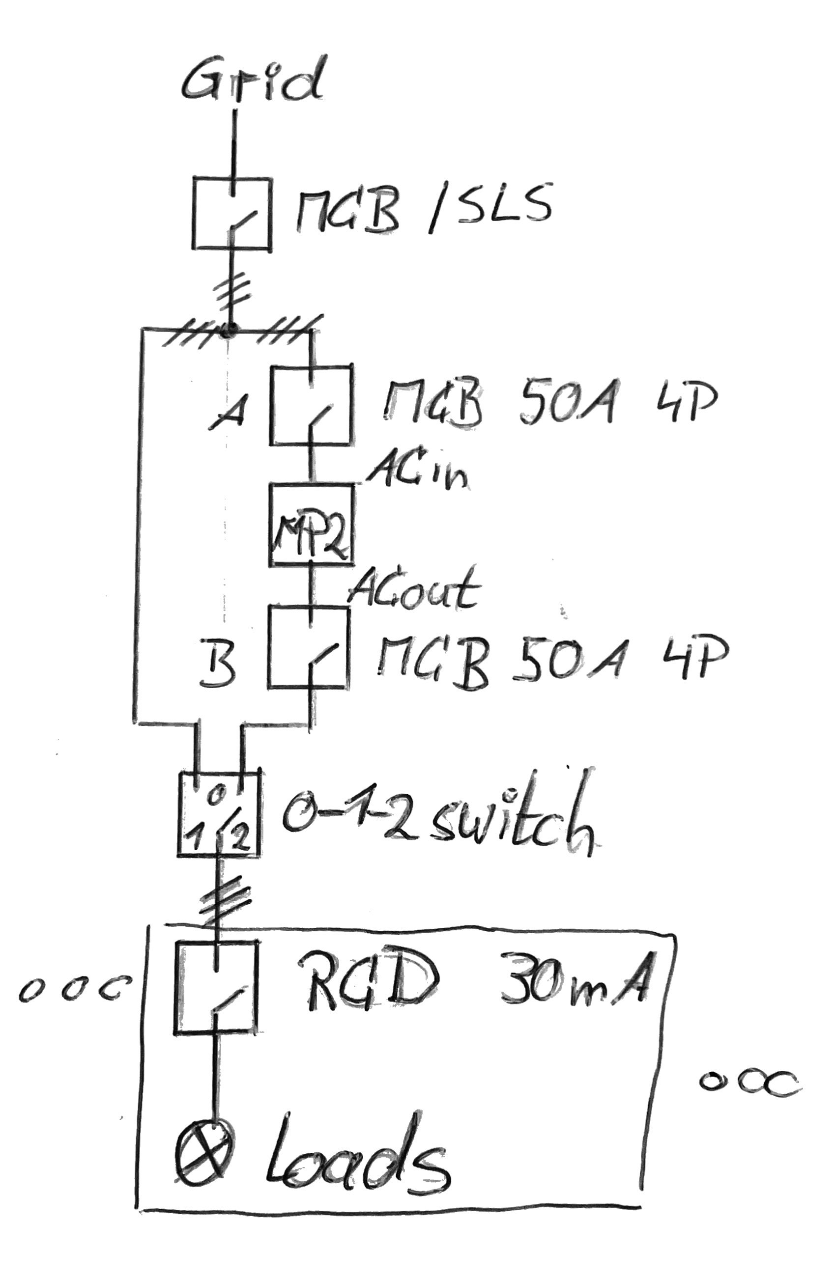 The loads are connected after the transfer switch and protected by RCD and MCB.