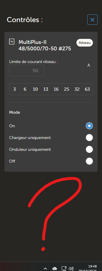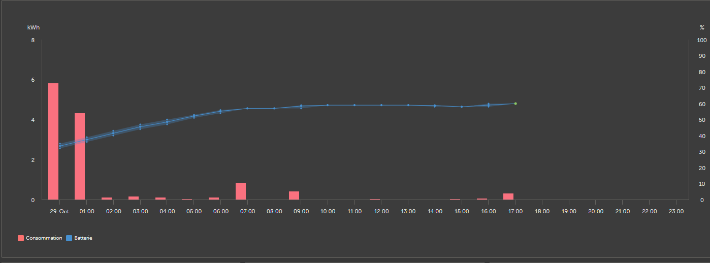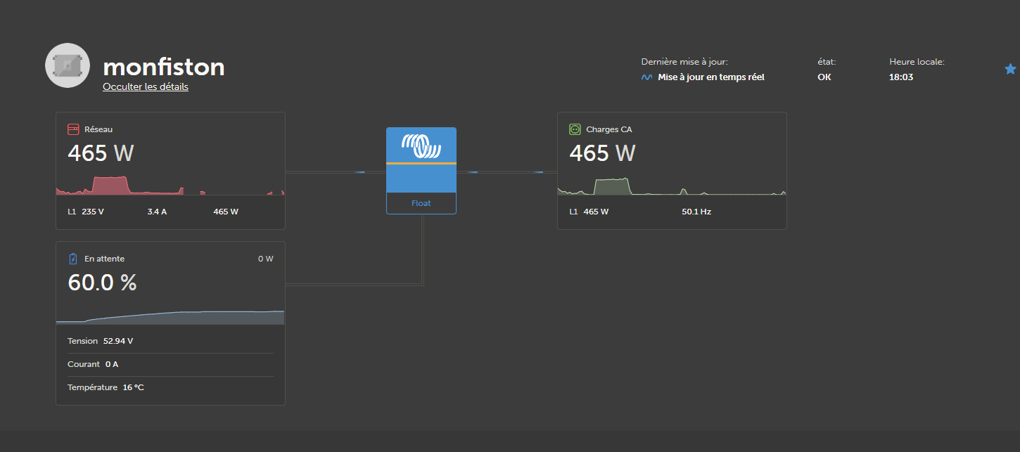 Since then, the Multiplus has continuously charged the battery, even when there’s no sun.