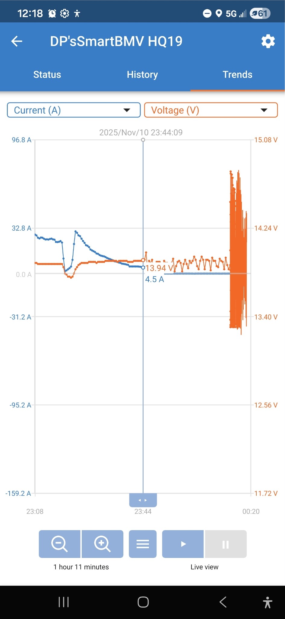 I’ve attached a few pictures of the Multiplus 12/3000/120 trend history. The transition from bulk to absorption is shown. Also shown is the repeated voltage/amperage cycling the Multiplus charger does as it attempts to re-establish absorption to the battery.