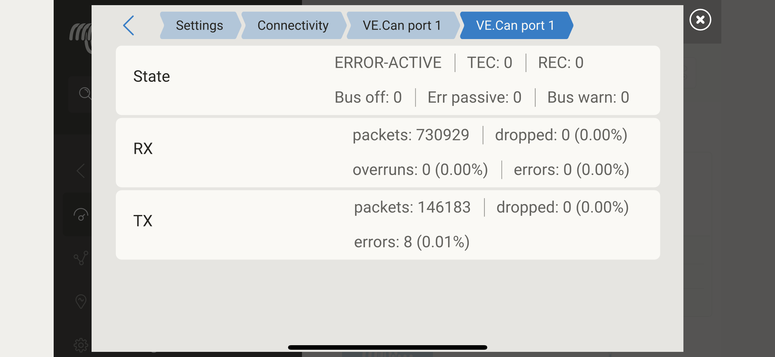I’ve redone all the Victron settings, and Pylontech confirms that the batteries are working fine and up to date. Here’s a screenshot of the VE.CAN network status.