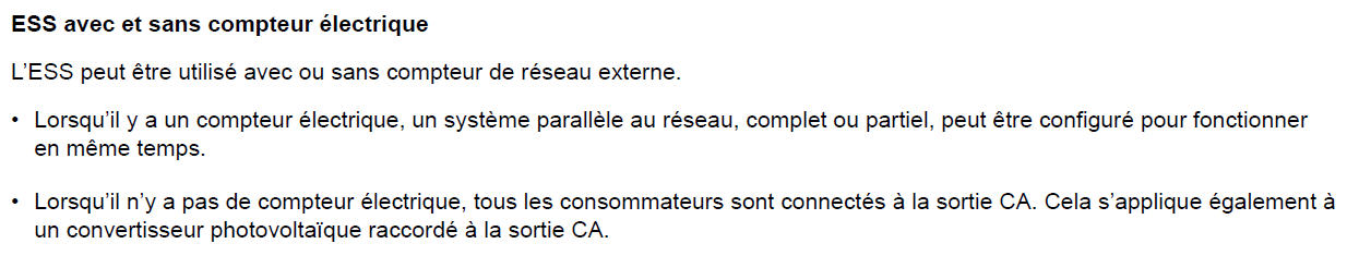 Pour le bon fonctionnement d’ESS, un compteur réseau est nécessaire. La sonde déportée est admissible mais pas recommandée. Un compteur de production photovoltaïque est nécessaire si l’intégration via Modbus n’est pas possible ou pas souhaitée. Je crois me souvenir qu’avec les micro-onduleurs APS l’intégration est possible. Je recommande de placer un disjoncteur pour le raccordement du tableau photovoltaïque (micro-onduleurs).