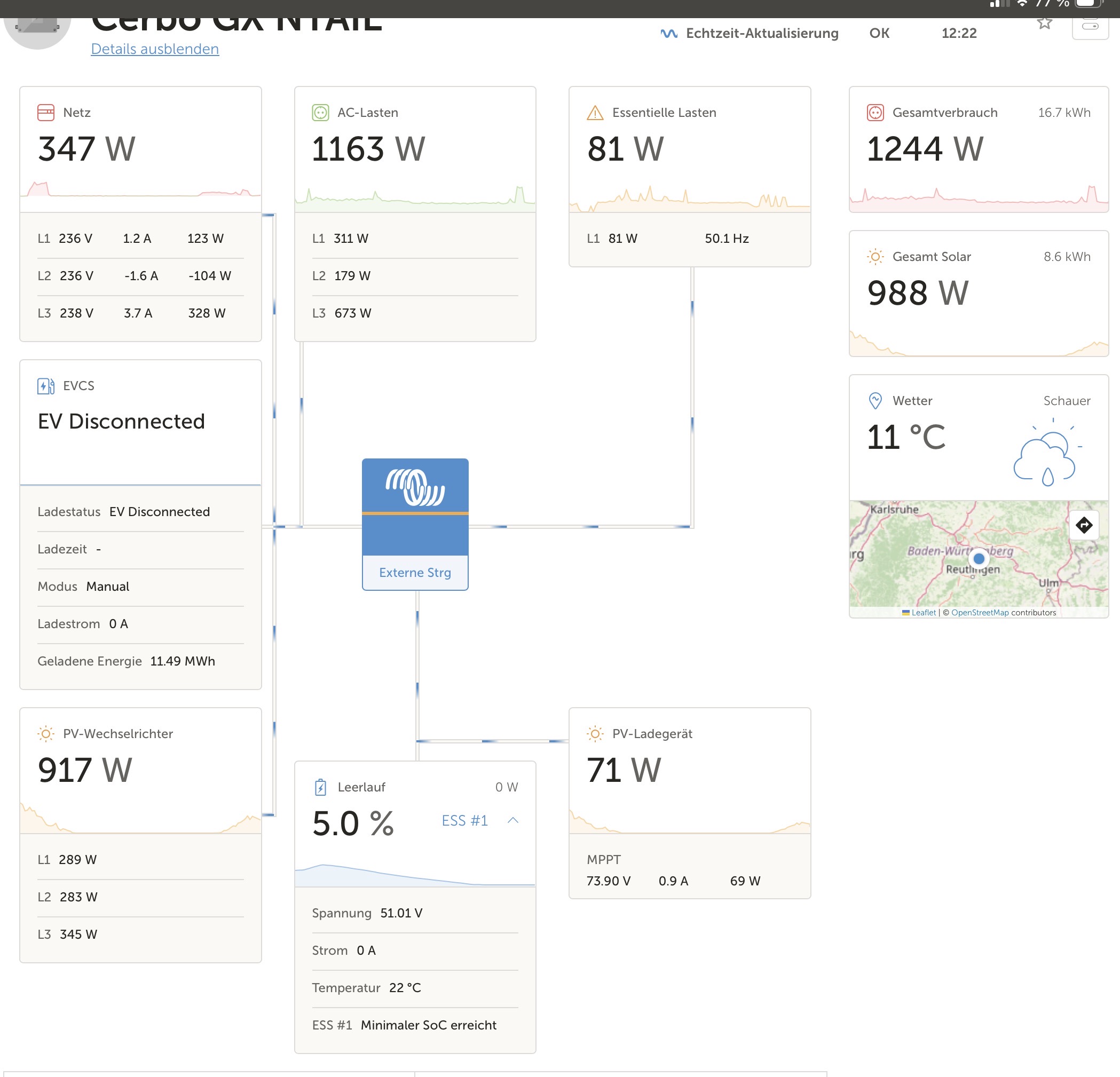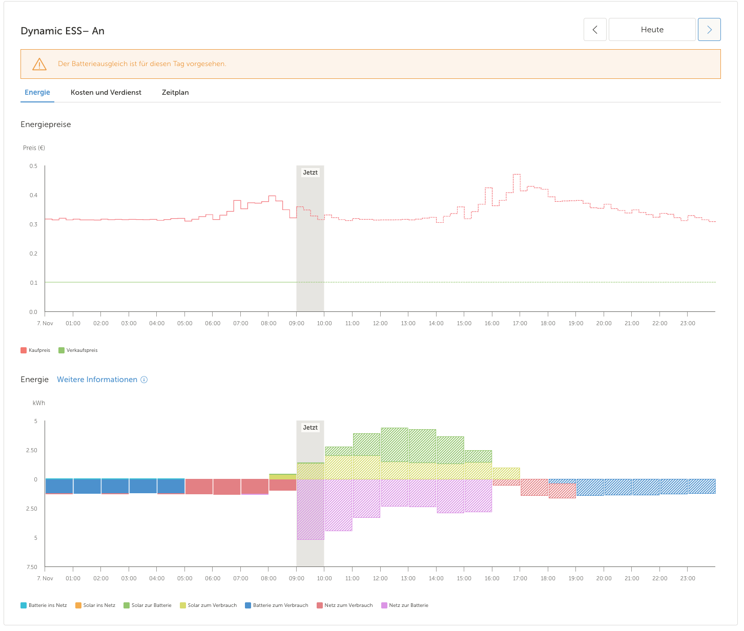Also jetzt habe ich wieder den Fall. Nachfolgend die Hardkopies. Danach sollte jetzt eigentlich die Batterie geladen werden. Gestern Abend hat das DESS für den frühen morgen Ladevorgänge vorausgesagt, nach dem SOC ist da nichts erfolgt.