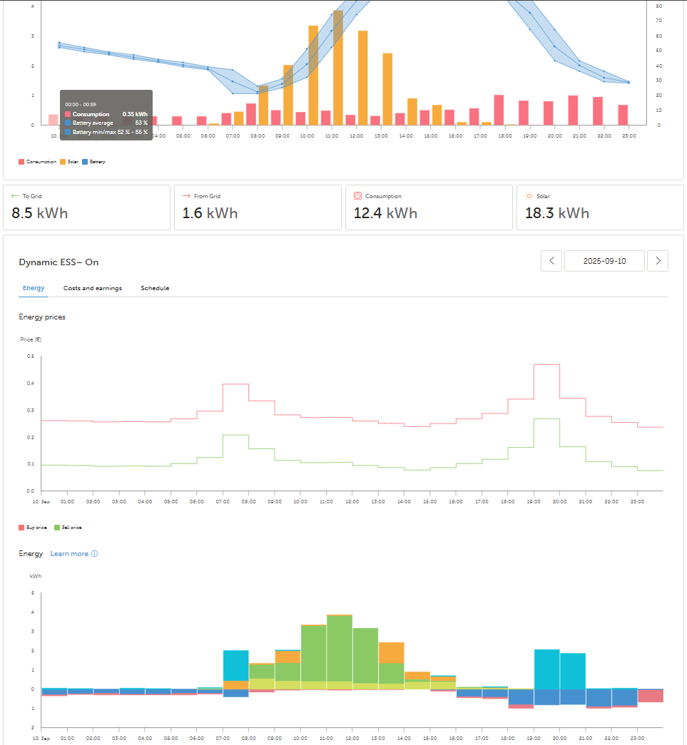 On the contrary, it can be seen that DESS sold about 2kWh on the evening of 11.9., which it then bought from the network 12.9.2025 between 0-6a.m. And it had planned it in advance.