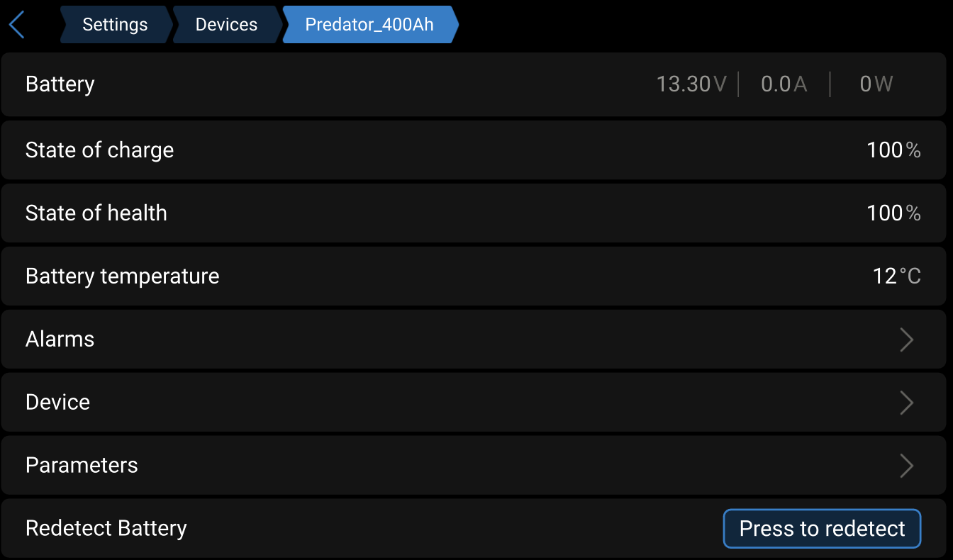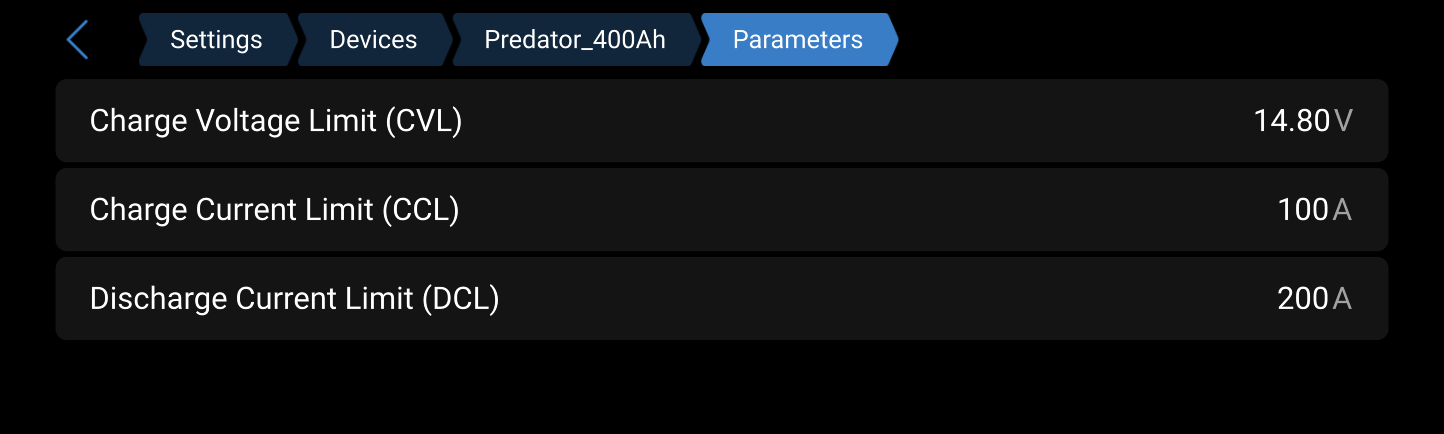 It’s still a work in progress in as far as the enclosure will take some time to complete and re-arrange as I’m time poor at present. So far I’m stoked with how easy everything is connecting and configuration is so simple. The only real challenge so far (besides the realestate restrictions) has been the Predator batteries CAN connection. Documentation is lacking and the Cerbo CAN settings were a trial and error excersize. Settings below for anyone headed down the same path. The Predator batteries have a simple addressing process if using more than 1 and once the correct settings were selected in the Cerbo GX the remote console showed the 2 batteries as a single device reporting current charge, output current, temp and whole bunch of other data and alarm states.