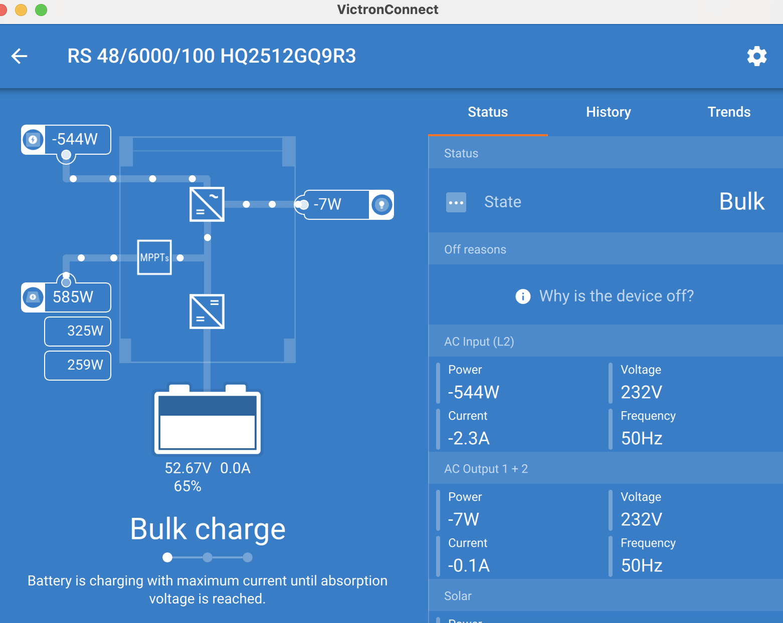 The current currently flowing from the Multi RS is from the solar panel connected to the RS.