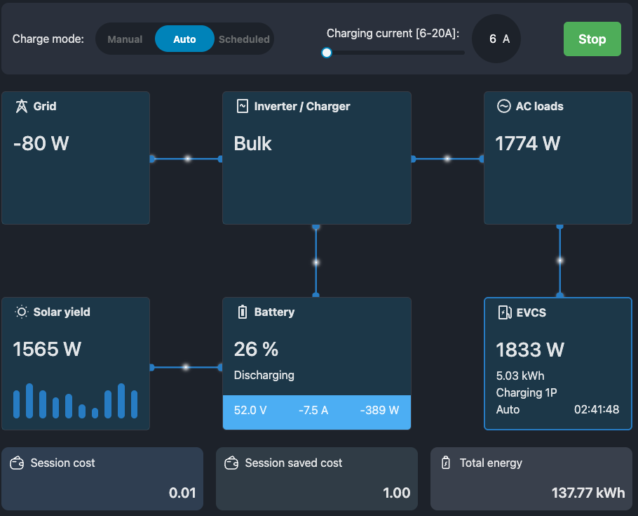 1 - When I typically arrive at home my battery SoC is usually at 100% (> 98%). That means that the MPPTs are only providing the necessary power to the house and when I connect the car to charge 2 things happen: