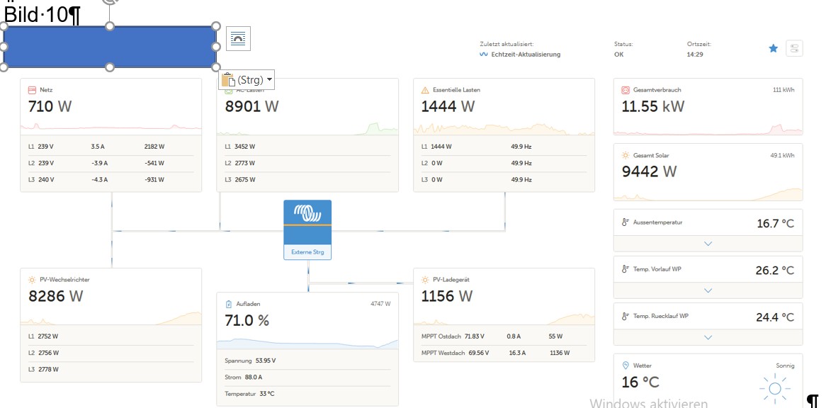 Zur Erklärung der Anlage: 3-phasiges System, basierend auf 3 Multiplus 48/5000, Cerbo-GX, ein EM24 RS485 zur Messung des Gesamtsystems (konfiguriert als Netz), 1. PV-Anlage wird mit einem weiteren EM24 Ethernet gemessen (als WR konfiguriert), 2. PV-Anlage ist über einen SMA WR 3-phasig direkt eingebunden, 2 MPPTs 150/35, Batterie DIY mit einem Seplos BMS.