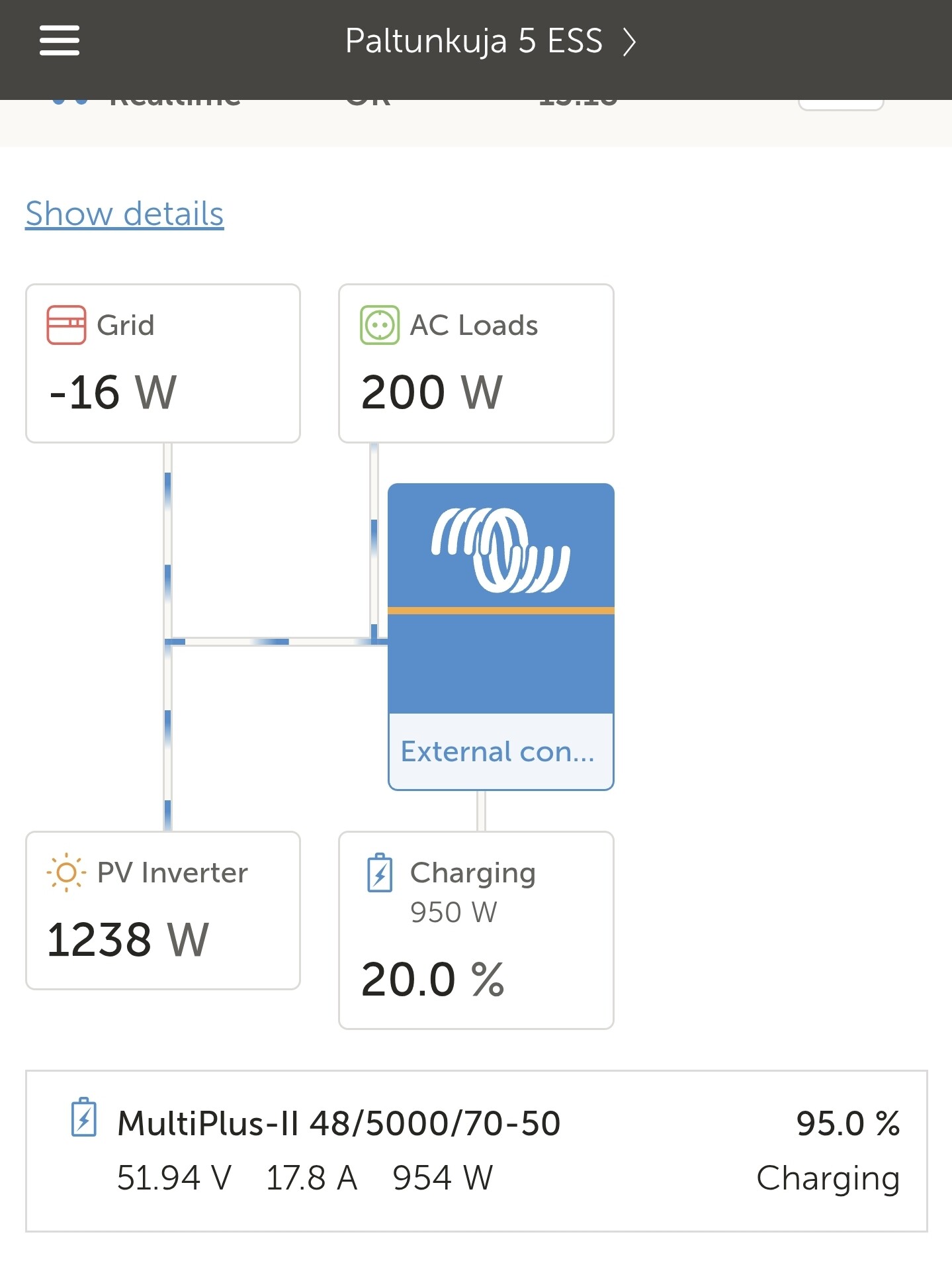 I previously showed that mine is accurate when discharging. Here is charging as well (diagram shows JK BMS power, Multiplus is not far off). SOC also behaves perfect.