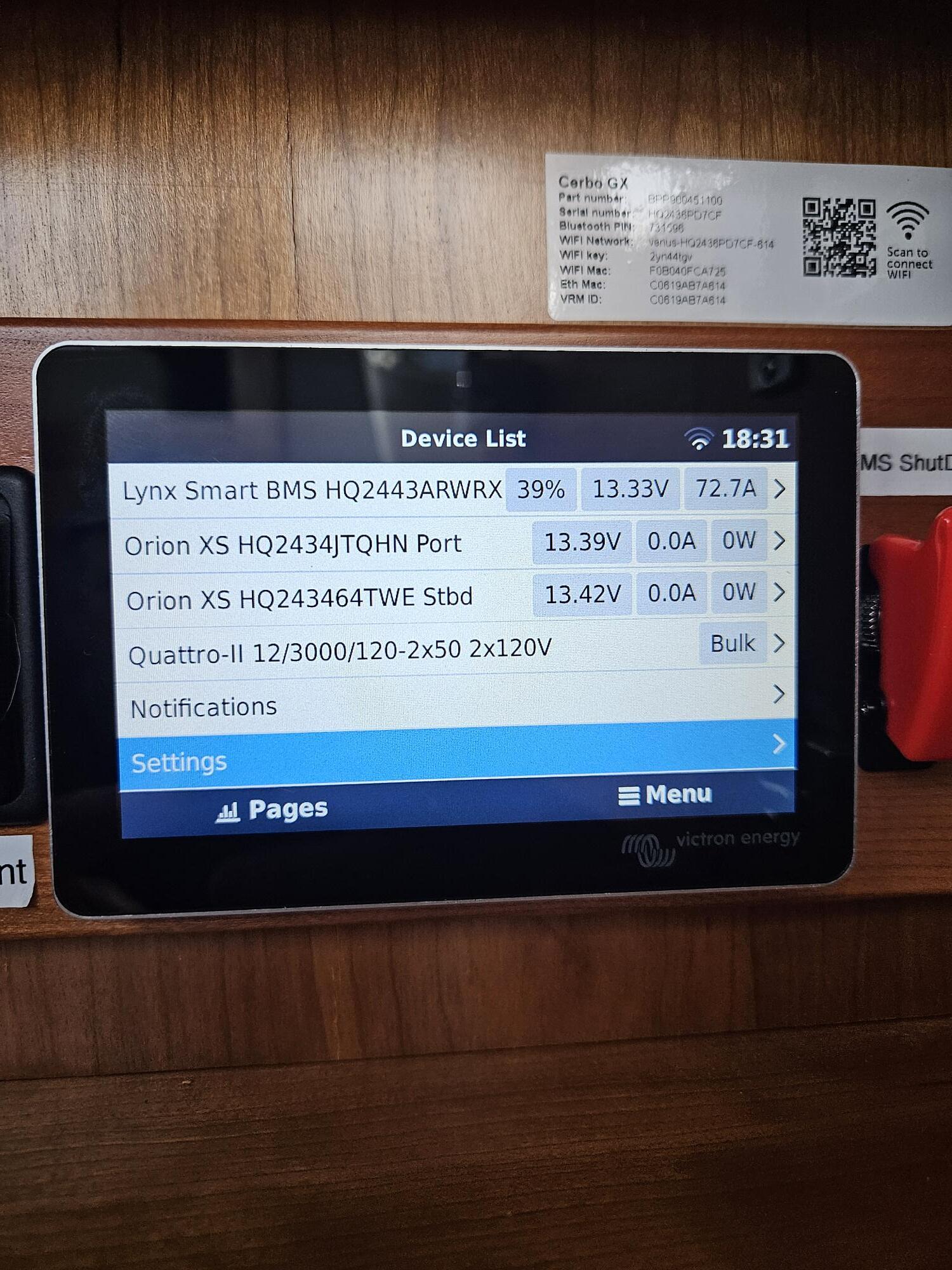 A strange situation does occur though when I have my PC connected to the Quattro II via the MK3 device. An error pops up on the PC screen saying Low Voltage, even though we are charging, not drawing on inverter/battery power. The indicator light on the Quattro for Low Voltage also turns on and charging stops. However, no error message shows on the Cerbo screen. The only way to reset it is to manually switch the Quattro off and on via the switch on the bottom. And then the problem reoccurs a few minutes later. This problem only seems to happen if I have the PC connected.