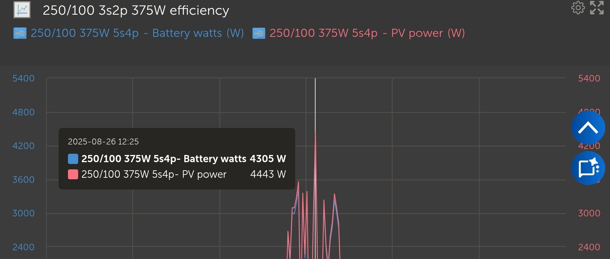 Meanwhile the 250/100 can charge with the same max 5.8kW, has a 70A Isc limit, Vbat+5V to start tracking and is not bound to a battery voltage factor as the upper limit, just the 250V (245V) max. That is so much easier to work with, to find valid combinations of panel numbers and string configs. I feel like maxing winter production with a 250/100 is just add a string or two more in parallel and bobs your uncle, done. No?