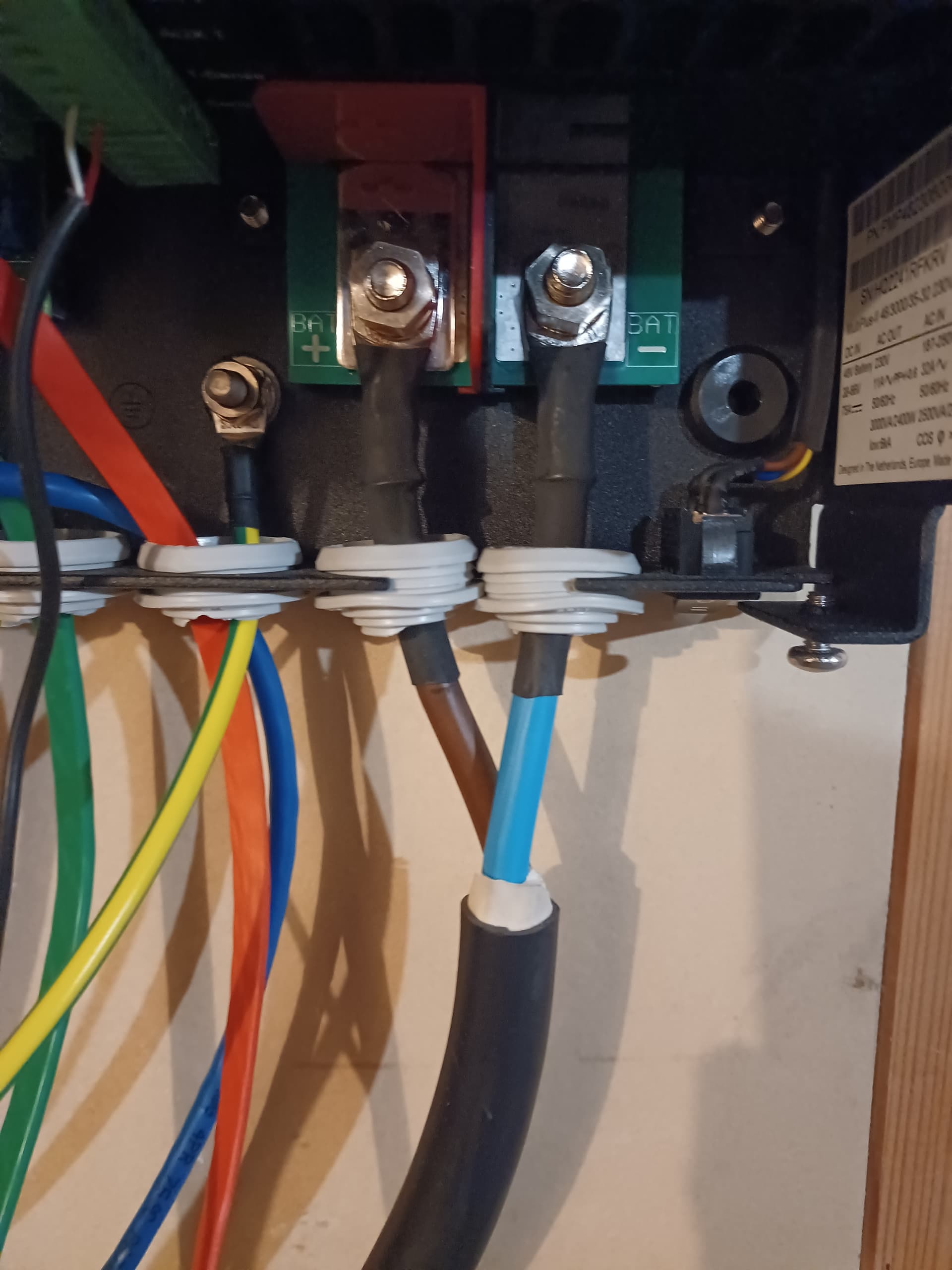 A première vue, tu as utilisé du câble CA non flexible (semi-rigide) au lieu de câbles DC à brins fins. Les brins fins sont absolument nécessaires pour le bon fonctionnement du courant continu. Il existe une recommandation sur la section des brins mais je ne l’ai pas retrouvée. De plus, la section des fils de 25mm² est insuffisante par rapport à la recommandation inscrite dans la documentation, 35mm².