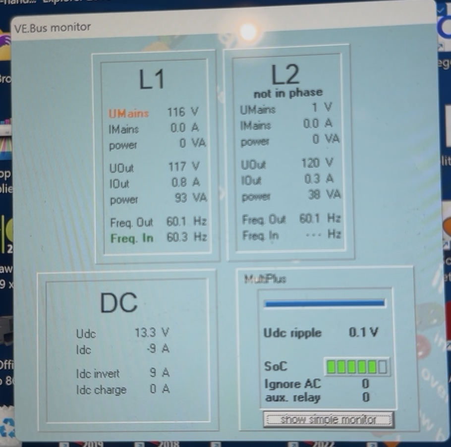 One more note about the VE.Bus monitor screen in the previous post. Note that in the L2 box, it says ‘not in phase’. I found this interesting. The 1V it is seeing is just noise, so not surprising it was ‘not in phase’ with L1. But I experimented a bit with this as I was always curious about the requirements of the phase relationship between L1 and L2 when arranged in a ‘Dual phase 180’ (split phase arrangement) with one of the ‘L2 floating’ options checked. I could not find any hard evidence on what the requirements were between L1 and L2 with this option checked in Victron documentation, but did find some reference on the old Victron community site that it was 180°±60°. I decided to test this out, to an extent, by feeding the L2 MP with the same phase as the L1 MP. Perhaps not surprisingly, the system rejected the grid input when L1 and L2 were the same phase.