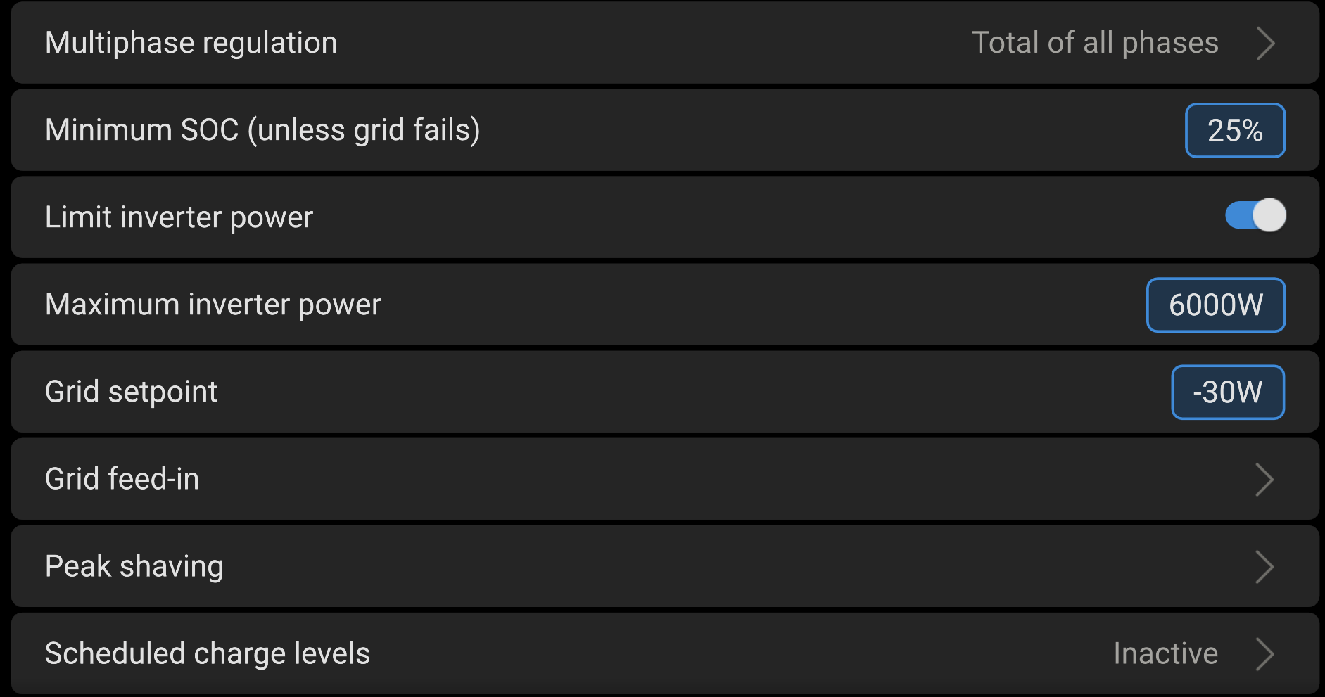 @Blendworth , do you have the -30W set all the time? Or do you only have that set during peak hours? I force charge my batteries 00:00 → 05:30. Does the -30W setpoint value get ignored during Scheduled charge levels?