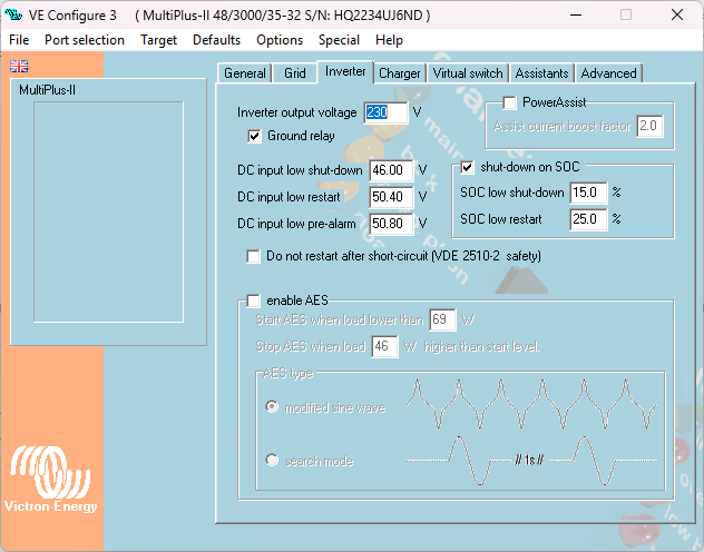 Removed ‘programmable relay (3)’ which prevents AC Input 1 from being ignored once the SOC reaches 75% during charging - no change