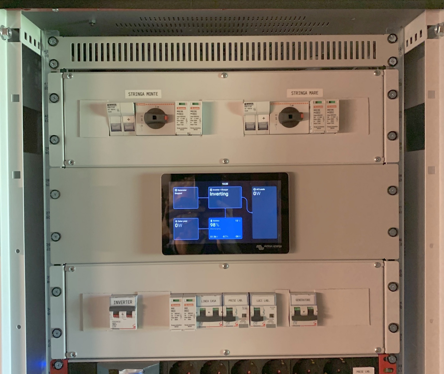 Thanks to the high integration level of the new Multiplus RS Solar, this is a fully off-grid power system designed to fit a single 19-inch, 42U rack tower.