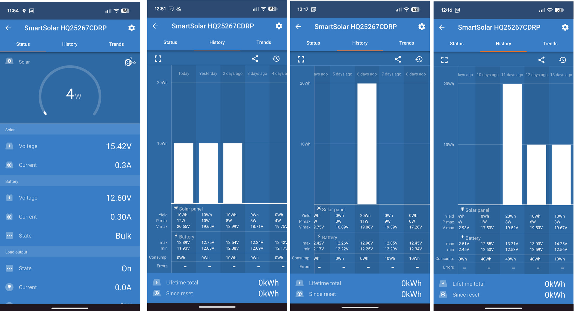 I recently upgraded to a Victron MPPT 75/15 solar charge controller. My solar panel is 20 watts, 12 volts. I have a 12 volt, 80ah AGM battery for my sailboat (to power accessories) and I’m just using the solar panel to keep the battery fully charged over the winter. The accessories are all turned off at the circuit breaker so there should be zero load on the battery. However, the controller can’t seem to keep the battery fully charged. I’ve posted screen shots of the Victron app showing the charging state over the past 13 days. Prior to hooking up the solar panel (13 days ago) I had fully charged the battery using an AC trickle charger up to about 13.8 volts. You can see from the screen shots that the battery voltage has been steadily dropping, as low as 11.93 volts today. Have I got a bad battery? Any ideas?? Thanks!!