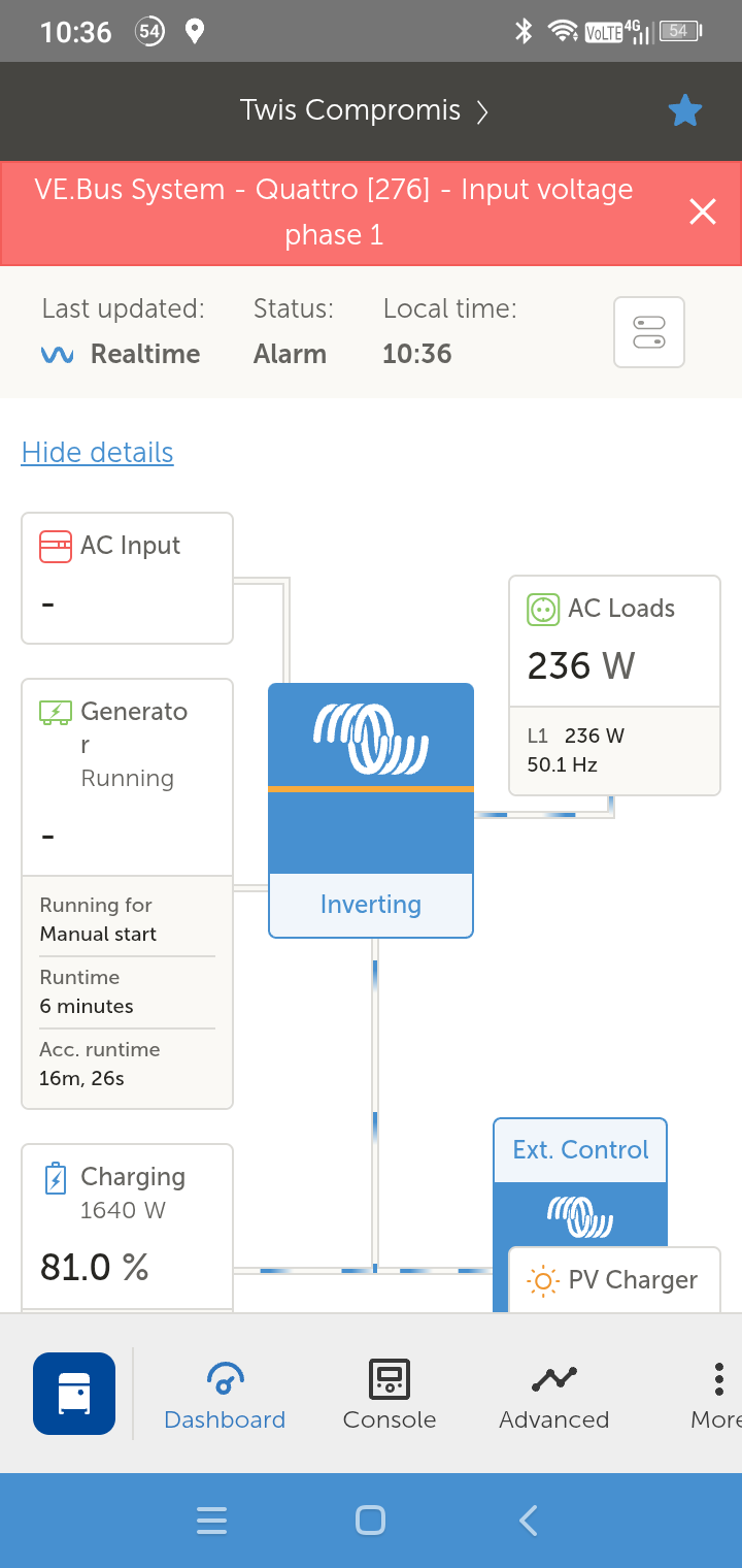 - My conventional Yamaha EF6600 generator, even at full RPM, likely experiences a momentary transient voltage dip below 195.5 V during the critical connection handshake with the Quattro. This dip occurs when the Quattro attempts to pick up existing loads (like the 0.75kW borehole pump, which runs from the inverter/batteries) and simultaneously begin charging the batteries (up to the 16A limit). This sudden, combined load (approx. 0.75kW + 3.68kW + Quattro’s inrush) is challenging for a conventional generator’s transient response. Even with “Weak AC” enabled, the Quattro, bound by the 195.5V threshold, will not synchronize if this dip is too severe.