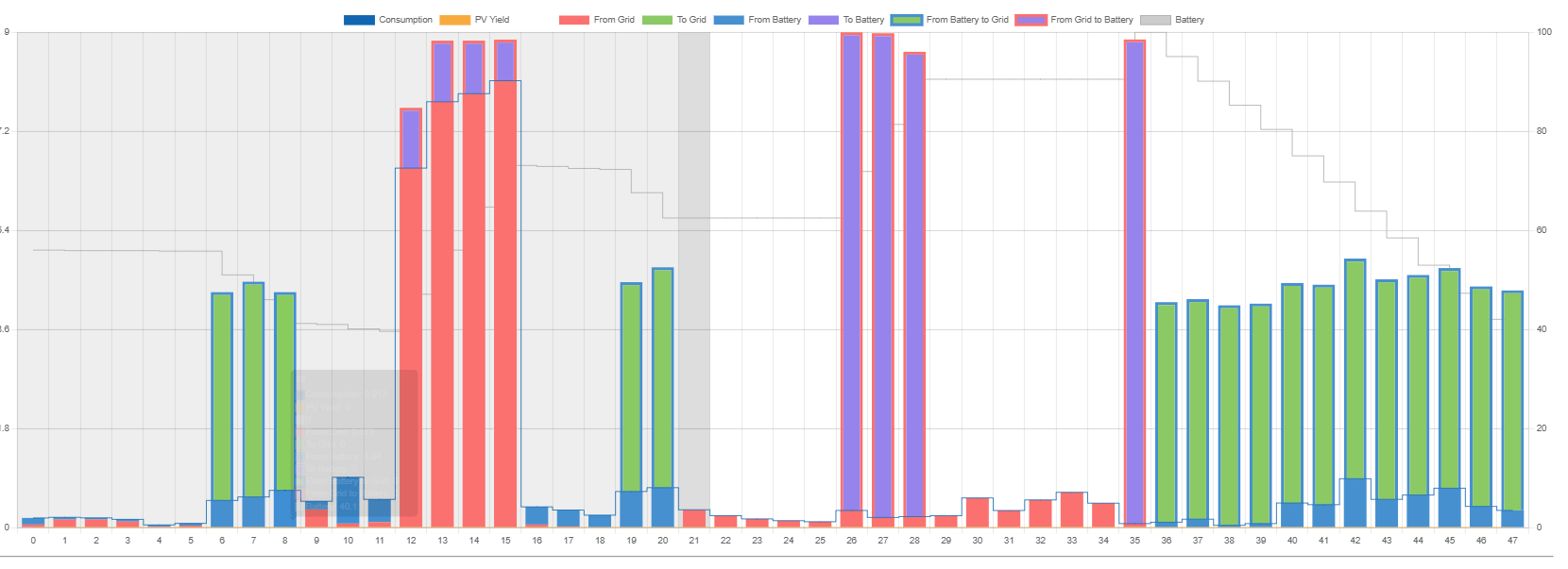 Before: 0/0 (turned off, see screenshot above). NO green mode, I force green mode in hours without expected trading “if (b==0 || soc < 30%) then strategy=green mode (1)"