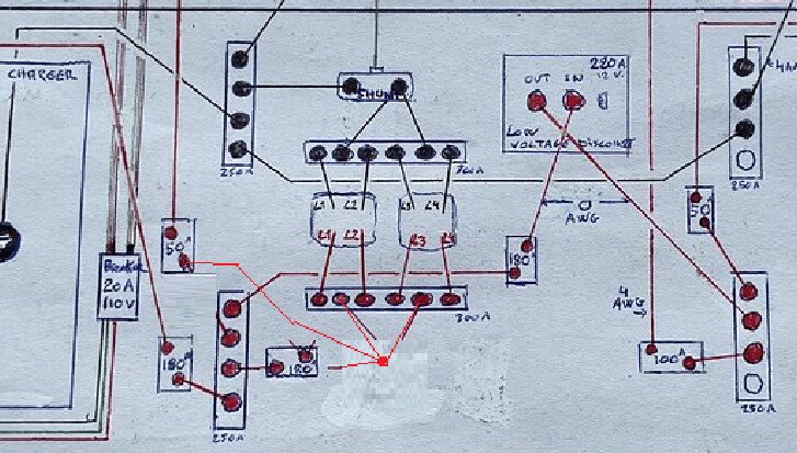 General note: You have both, the inverter and the bus-bars, connected with a 180A Breaker, assuming it’s the same kind? When putting breakers in series you can choose Models with different characteristics (i.e. milliseconds they allow excess current) to ENSURE that your inverter-breaker is always tripping first - before the overall DC-Breaker disconnects everything including the MPPT. With regular fuses that is “builtin” with the size of the fuse, for Breakers you need to check the Characteristics. A 180A and 250A may just trip in random order if the current out of sudden hits 250A+