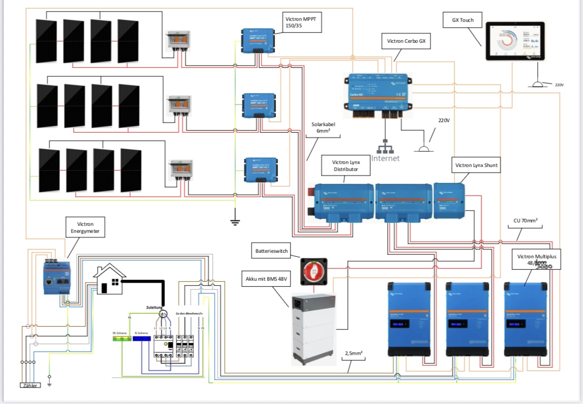 Ich hätte es gerne so, dass wenn ich mehr als 3000W auf einer Phase ziehe, der Rest aus dem Netz gezogen wird. Wenn es dann wieder weniger wird, soll alles wieder normal über den Akku und die Wechselrichter laufen.