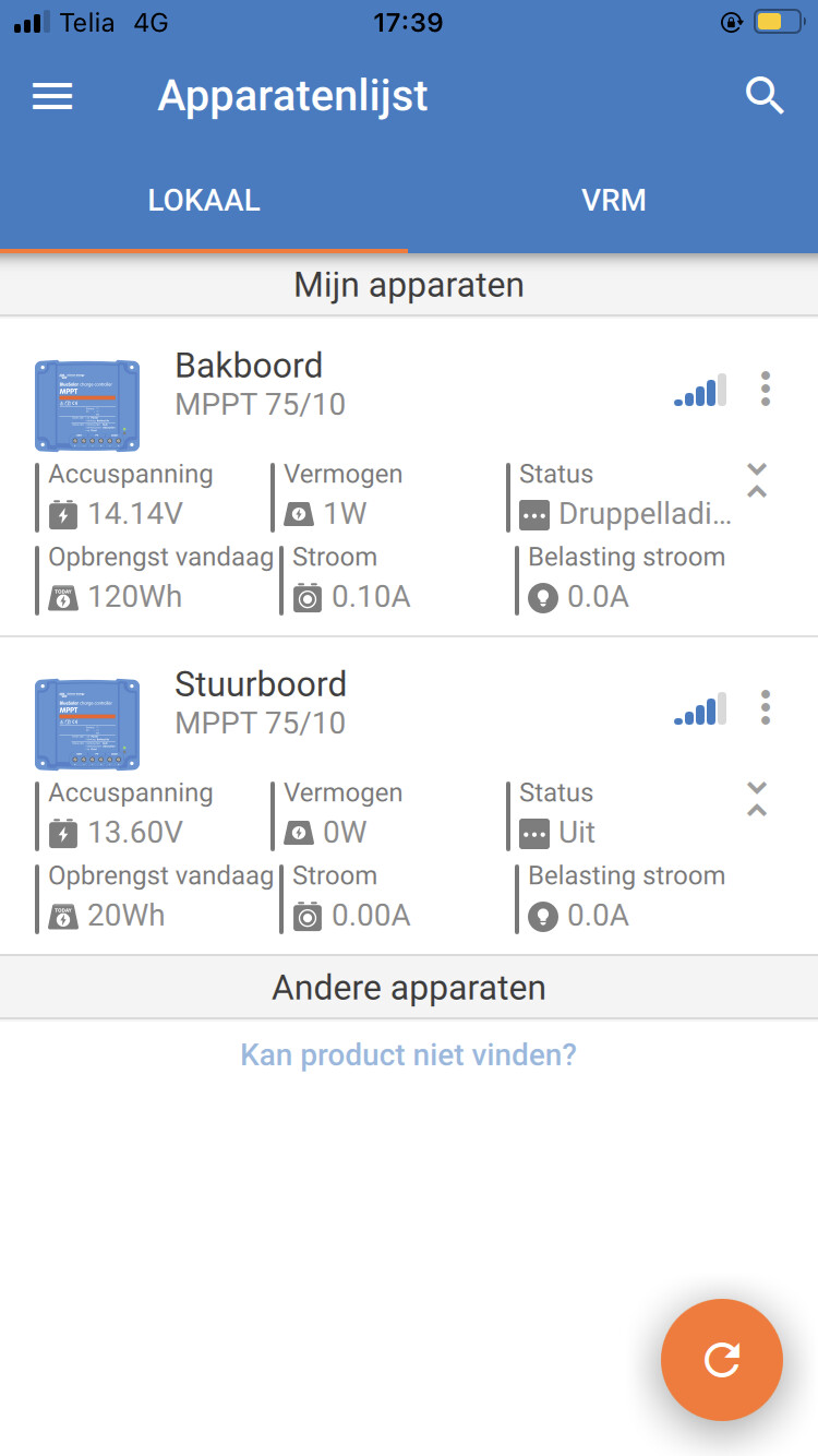 The photo that is showing the different voltige on te “bakboord” and the “stuurboord” mppt is a photo taken while the boat was connected to the 230v battery charger. The data that is displayed on the “stuurboord” mppt is at least 2 days old.