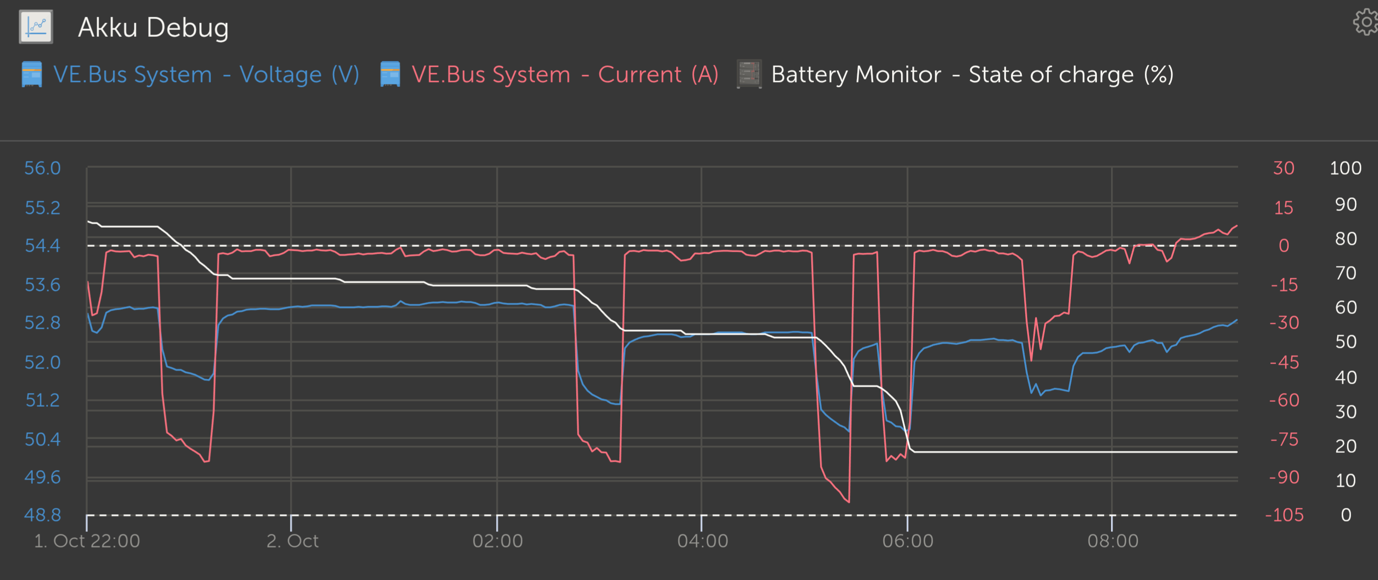 Der Akku wurde heute Nacht auf “16 %” SOC entladen, obwohl nur 10 kWh entnommen wurden. Das sollte eigentlich einem SOC von etwa 30 % entsprechen. Heute Mittag überschreiten die Zellspannungen schon 3,45 V und der SOC zeigt zeitgleich 86 % an.