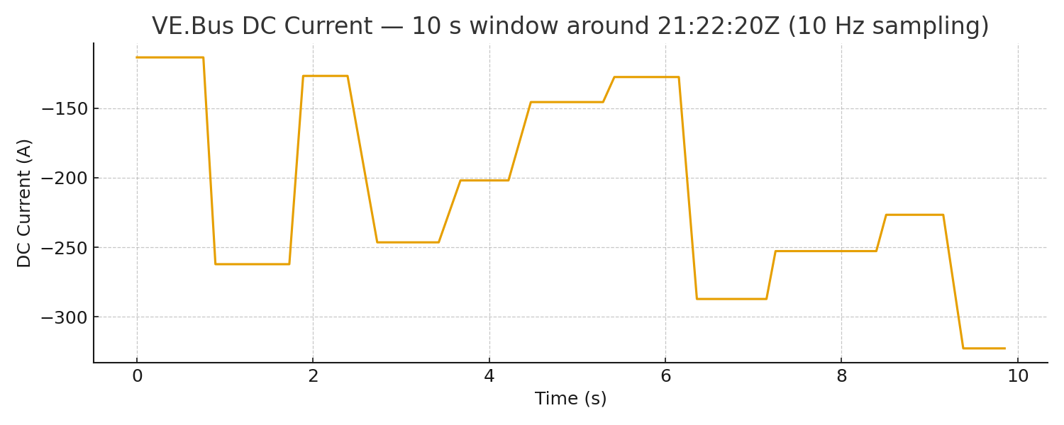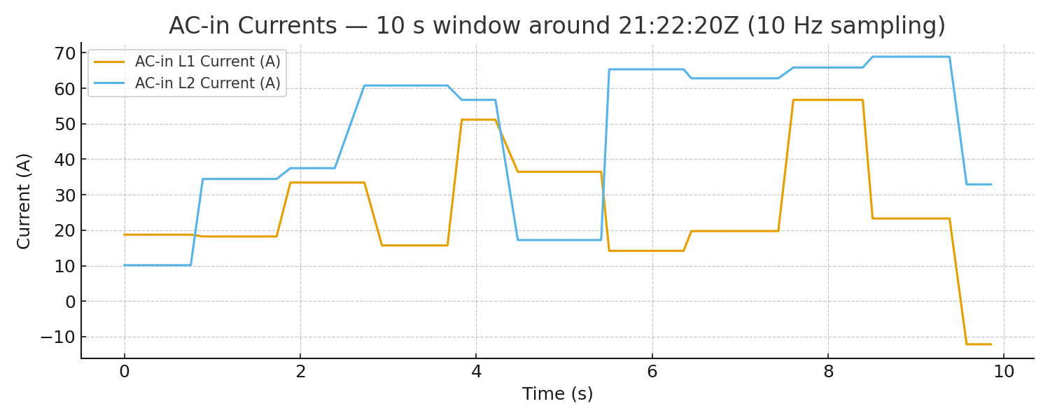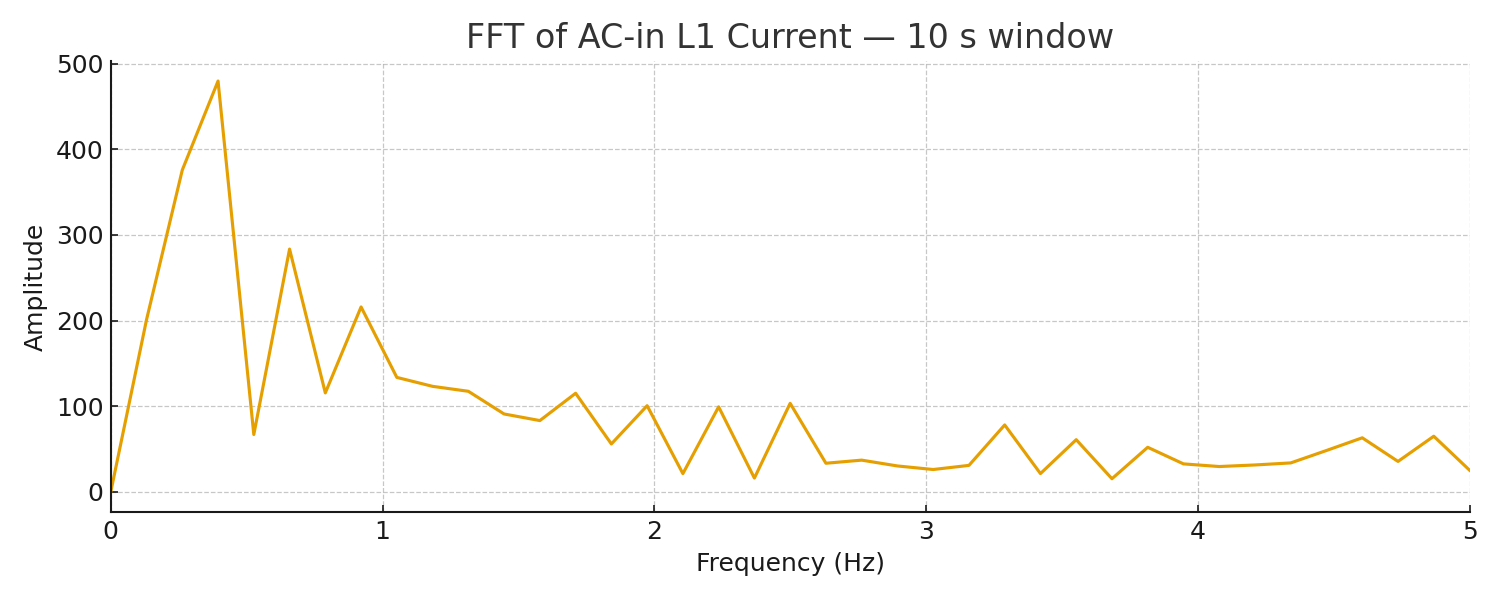 Attached are 10-second plots at the onset (21:22:20Z). AC-in and DC currents show periodic swings roughly once per second, with dominant FFT energy below ~2 Hz. This supports a VE.Bus ESS control-loop oscillation while grid-connected. I can share a longer clip or higher-rate segment if helpful.