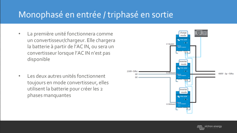 Bonjour à tous, je dois réaliser un système triphasé depuis un réseau monophasé avec 3 multiplus 2.