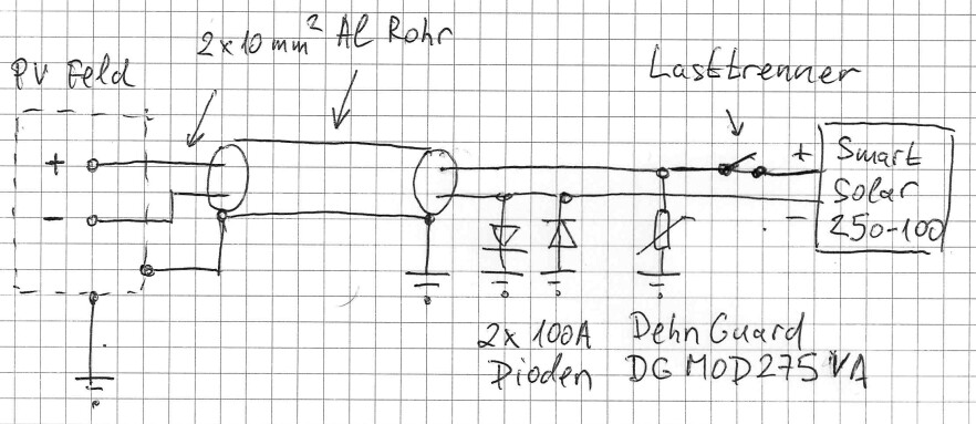 Da du eh beide Leitungen einzeln absichern musst, kann es somit zwischen (+) und (-) ja nicht zu einer höheren Spannung kommen. Und man muss die Energie ja irgendwohin ableiten, daher gegen Erde. Theoretisch würde ein solcher Schutz auch direkt zwischen den beiden Leitungen reichen, denn die Spannungen würde ja einfach nur oberhalb von 150V kurzgeschlossen, doch die Energie könnte nicht weg. und es würde sich ein Potential aufbauen, dass dann an der schwächsten Stelle im System zu einem Durchschlag o.ä. führt. Daher ableiten und gut ist.