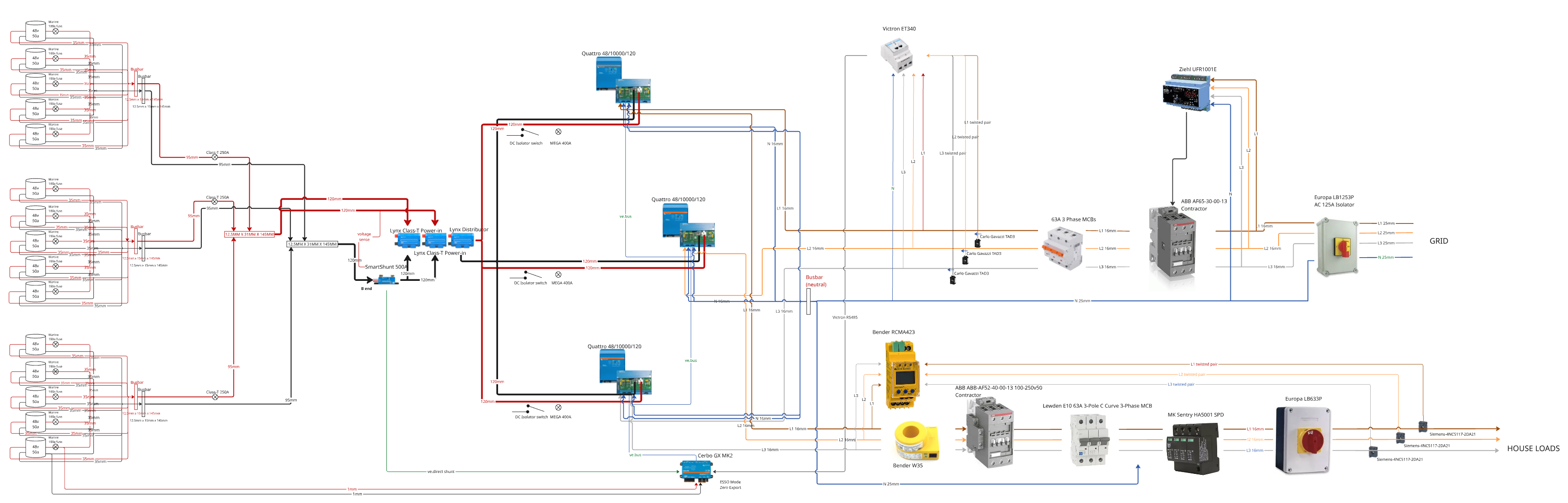 Connection: Each Quattro is connected to the main DC busbars via 120mm² cables.