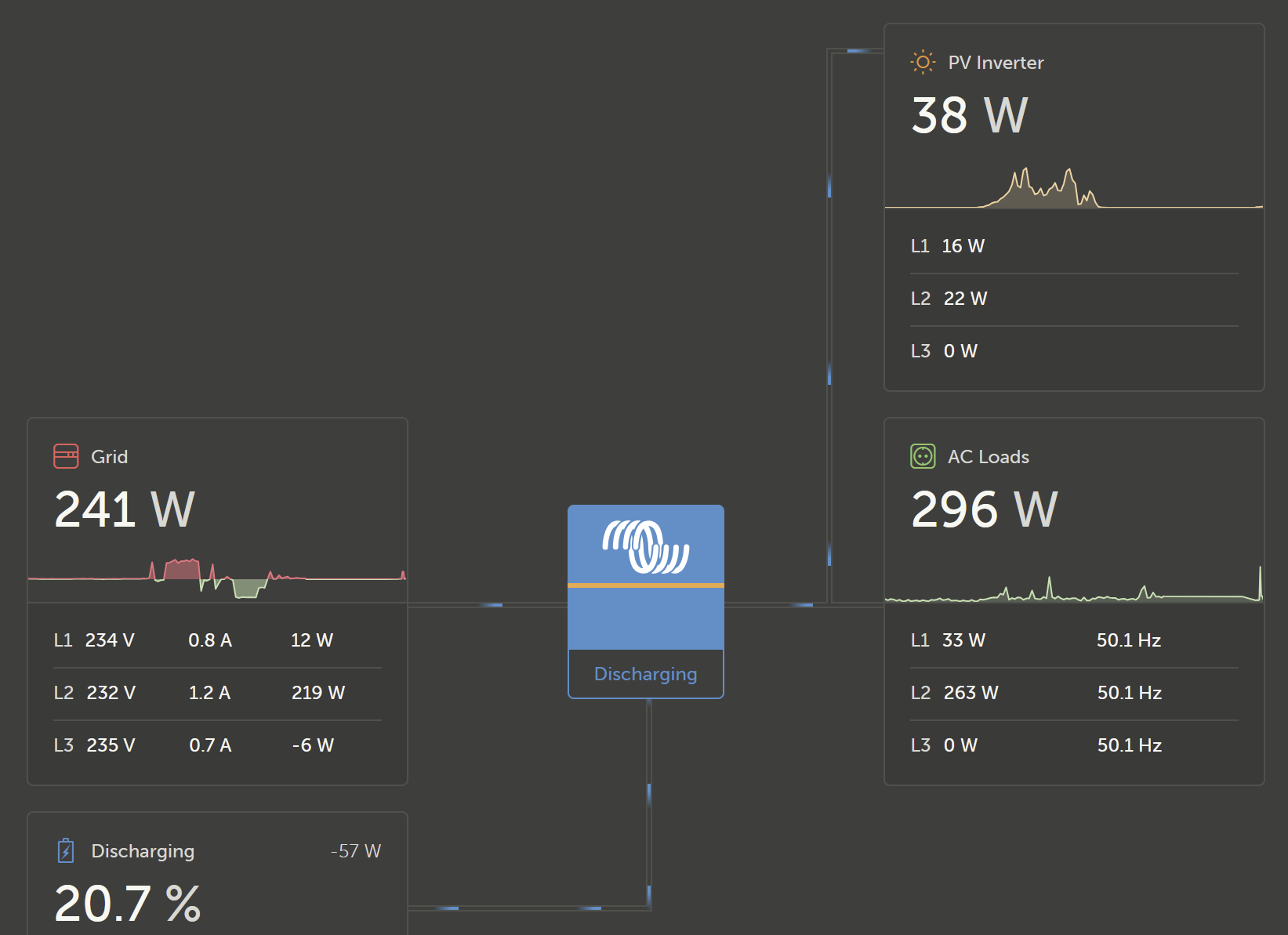 - Shore connected, MultiPlus charging (ESS keep batteries charged, mode 2). And again automatically throttling charging or even inverting to safeguard the mains L1 25A limit.
