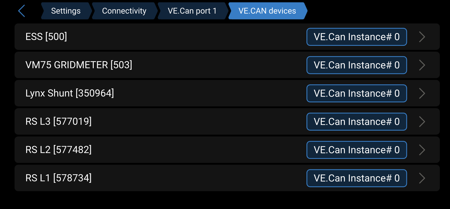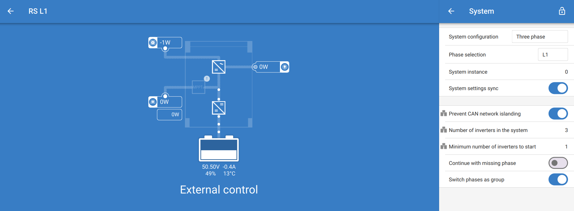 Installed a 3-phase Multi RS Solar system with 30kW batteries. I finished the configuration of all parameters of the batteries and the Cerbo, Multi RS Solar in 3-phase configuration, Lynx Shunt and the VM-3P75CT via ethernet. On VRM and the Cerbo GX I get a good overview of the total system. However, if I enable the energy meter support, the Multi RS Solar tells me that the meter is missing. Somehow, the Cerbo GX is not publishing the metering values on the VE.CAN 1 bus where the Multi RS Solar is connected. I followed the chapter connecting an external meter ( 4. Installation ). Tried a lot of different settings. All firmware is up-to-date. For the Cerbo GX I installed the latest large beta version. I really do not know what I am missing. The picture below shows that the external meter pops up correctly in the VRM (or Cerbo GX information) and show the values from my grid connection at home.
