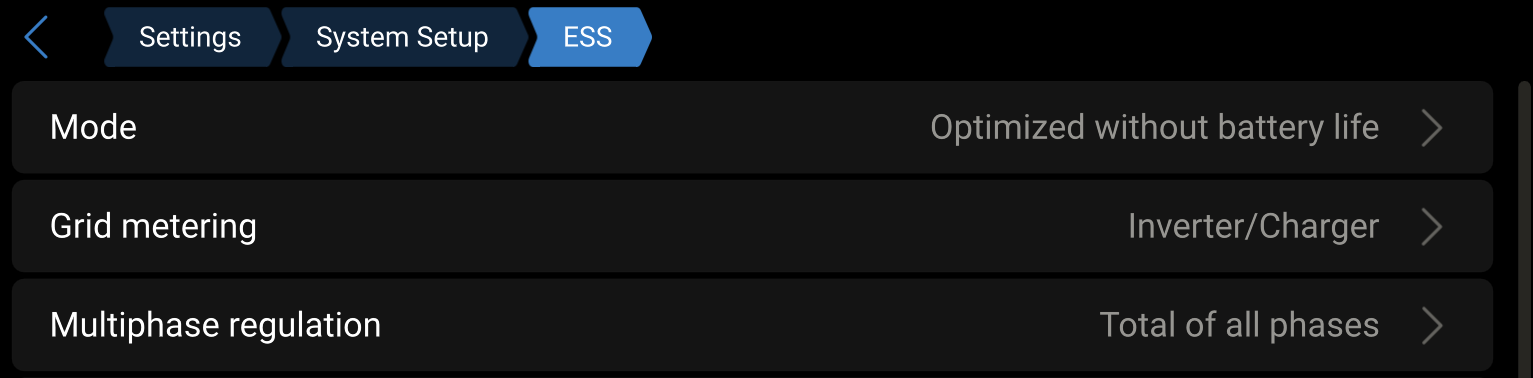 As the Cerbo GX suggest, I show what I see at the Multi RS Solar (Unit L1) what I can set on ESS mode, see image below. This setting should also start to charge the batteries but that is also not happeing. So many weird things happen that I do not understand. All the information from the BMS, Multi RS solar (3x), Lynx Shunt and Metering (ethernet connected) is correctly read by the Cerbo GX, but the Multi RS Solar is not receiving the Metering data itself. While the manual tells me that should be. What could I try?