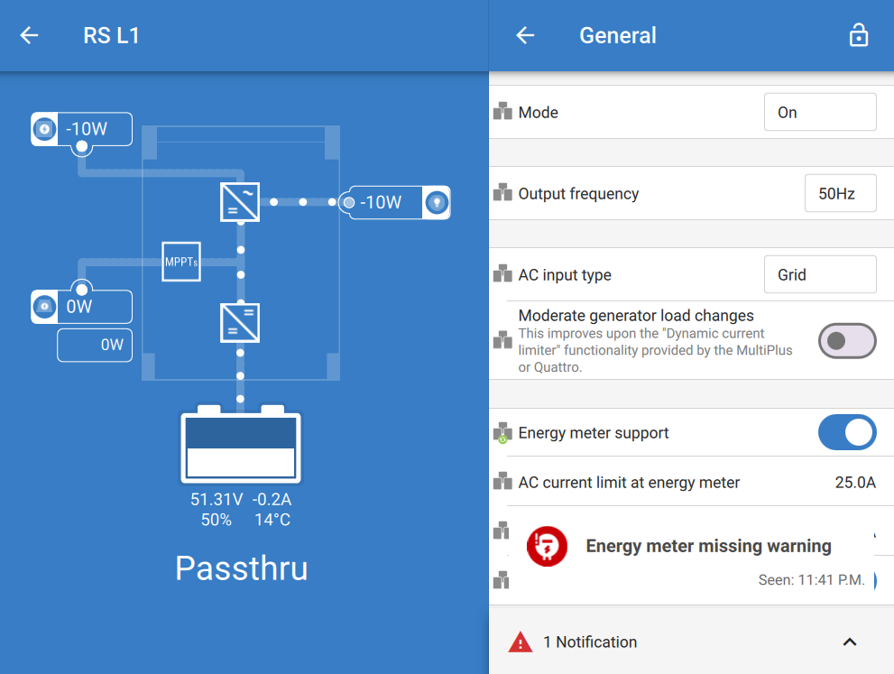 @macsnoeren Firstly I’d suggest reverting to the latest official firmware and not Beta, let alone with the large image unless you are planning to use Node-red. You need a solid baseline. If you are running ESS, make sure to select the correct metering. Also, what speed is the Multiplus RS’s VE.Can port set to? Interestingly the meter appear to have been visible but then lost contact. What has changed or was done at that time?