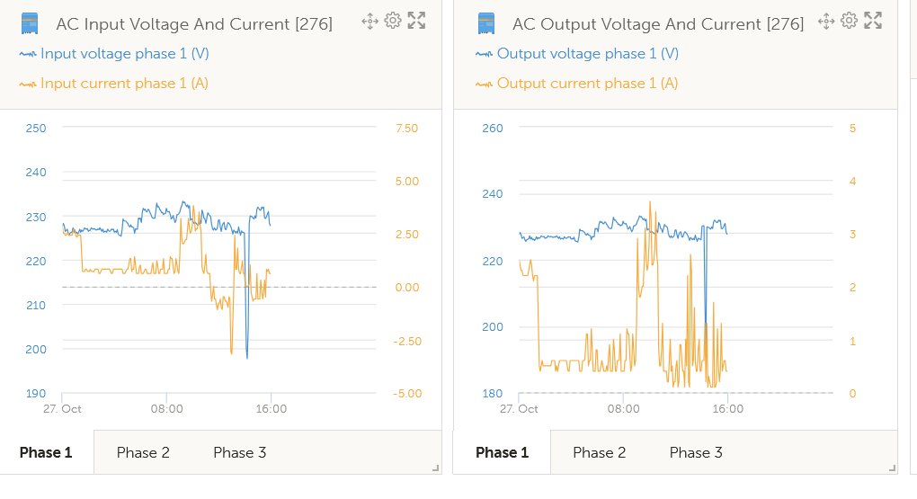 On some occations I get the alarm that connection to the grid is lost or there is a problem with phase rotation. The connection to the grid is usually not restored until I restart the Multiplus. After those occasion it happens often that I have somewhere a dead heating pump or a dead usb-charger or something similar. Today it happened again. I looked the voltage history up and noticed that there has been a very low voltage on all the output phases (190V). On the input side from the grid(AC input Voltage) 2 phases had the same low voltage and von phase had a very high voltage (315V).