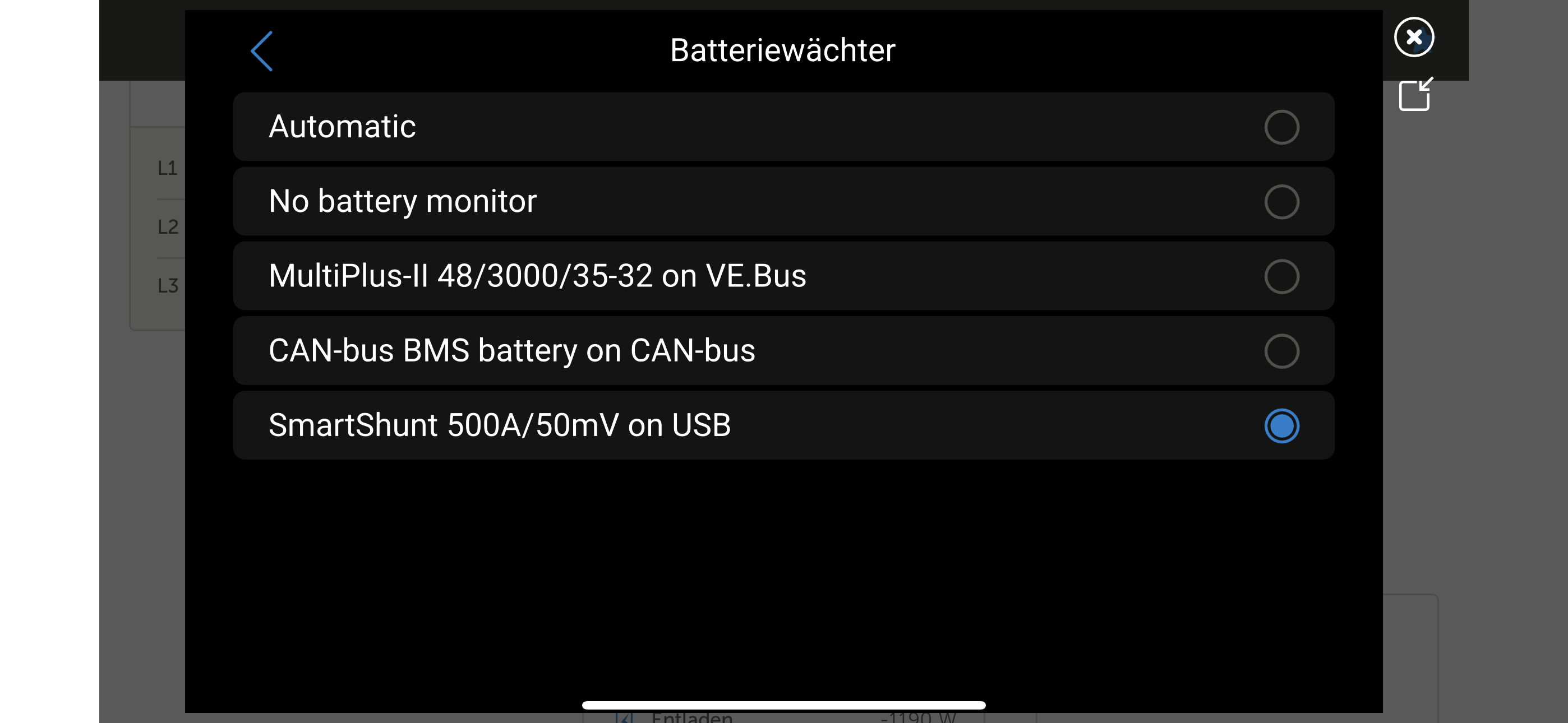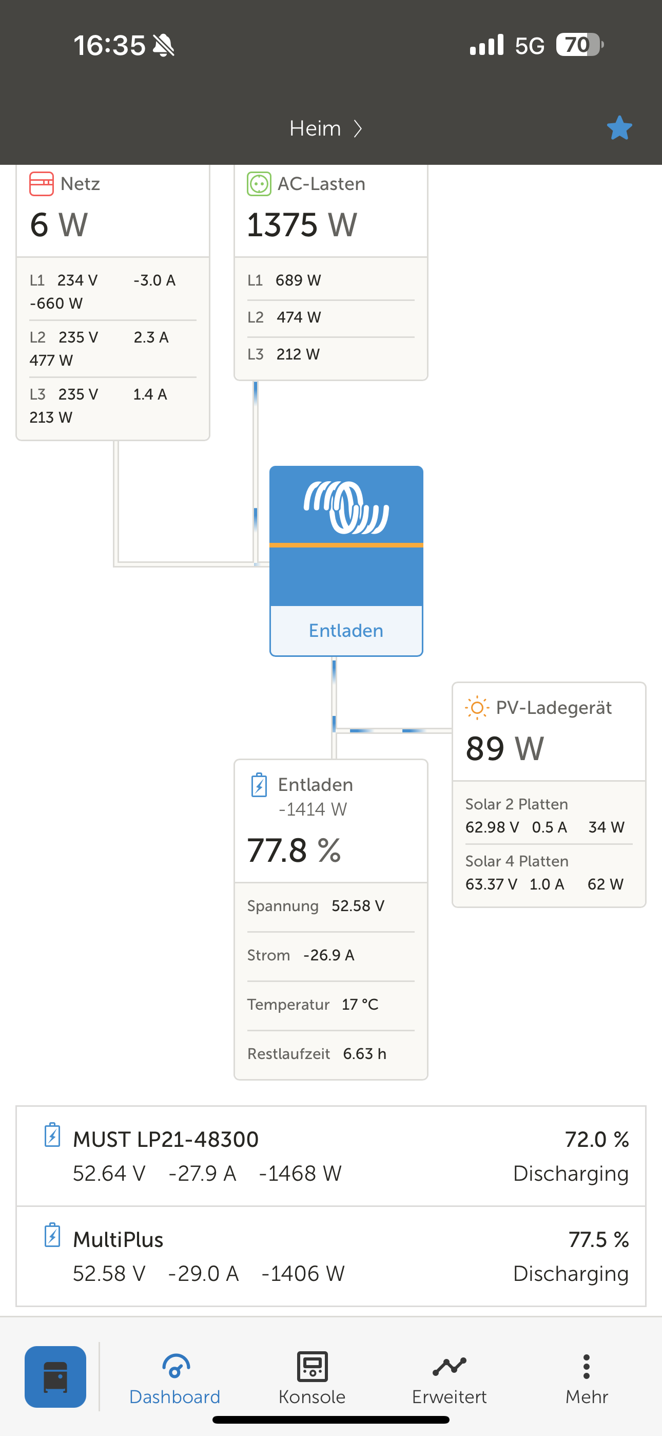 Also es ist ein DESS System mit nen Multiplus 2 GX der nur am AC1 in angeschlossen ist. Habe ne 3,6KW PV Anlage mit Solax Wechselrichter der Überschuss produziert den der Multiplus in den Akku speichert. Ausgangsleistung des Multiplus ist auf 1,5KW begrenzt. Dann hab ich noch 2 SmartSolar 100/20 mit einmal 0,4 und einmal 0,8 KW mit dran DC seitig versteht sich … alle gesteuert vom BMS soweit ich das sehe. Speicher ist jetzt ein Must Lp2100 48300 15KW. Dieser hat in den Einstellungen eine Vorgabe für CAN wo man direkt Viktron einstellen kann. Hab ich auch so gemacht und lief auch sofort.